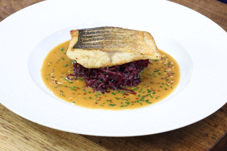 Pan fry the seabass in oil and butter for 2 minutes flip over and repeat.
